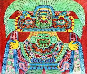 She carries in her headdress a bird that is probably the celestial bird of creation and from her headdress and or back erupts two intertwined tree branches that spread into more tree branches they are both yellow and red. The yellow probably symbolizes earth and the red both blood and water. For the Mesoamericans thought of water has symbolically the blood of the gods. And blood like water that nourished the ground and man and beast, nourished the gods. In the branches are butterflies and spiders. The spiders represented the essential femininity of the goddess and the butterflies probably played into her role has creator.